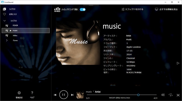 そのため初期設定にプラグインの導入などを必要とせず、設定メニューから接続したUSB DACを選択するだけで、WASAPIでのハイレゾ再生が行えるようになるという、シンプルな操作性を特徴としている。