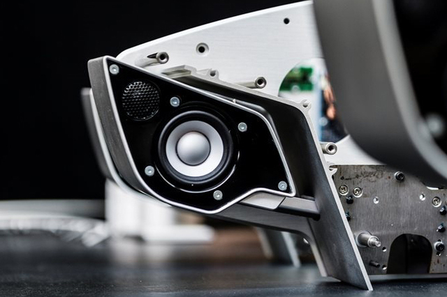本機は3ウェイ・合計10機のスピーカーユニットを搭載するが、最大の特徴となるのがカタツムリの角のように伸縮するサテライト・スピーカーだ。再生時には、このサテライトスピーカーが外側に自動で伸びる(完全に収納した状態での再生も可能)。