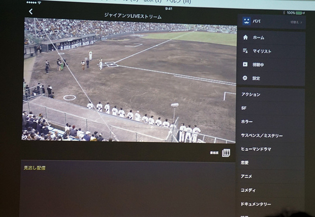 リアルタイム配信については、現在巨人戦、BBCワールドニュース、FOXチャンネル、ナショナルジオグラフィックを配信しているが、これをさらに強化するという。具体的な名称や内容は本日時点で明らかにされなかったが、ニュースを2チャンネル増やすほか、音楽チャンネルも近々配信を開始することがアナウンスされた。