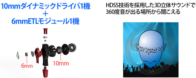 本イヤホンは10mmダイナミックドライバー1基に加えて、HDSS技術を実現するための6mmETLモジュールを1基搭載している。360度全方向から繊細な音を聴くことができ、特に3D立体音響で作られたゲームやVRコンテンツをよりリアルに楽しめるという。