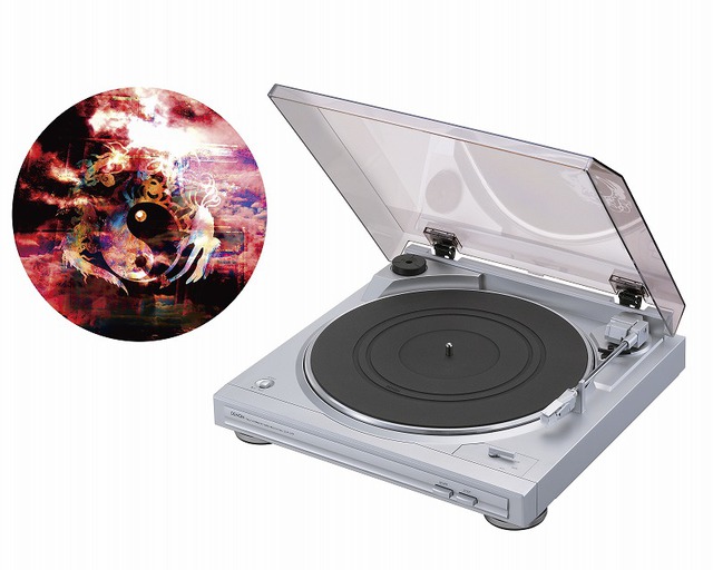 レコードプレーヤーは同社「DP-29F」のダストカバーに陰陽座のロゴをあしらい、オリジナルデザインのターンテーブルマットが付属したもの。コンパクトサイズながら、簡単なスイッチ操作で再生ができるフルオート機能を搭載している。