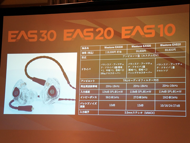 EASシリーズは、環境音も聴こえる“アンビエントモニター”。BAドライバー3基の「EAS30」、2基の「EAS20」、シングルBAドライバーの「EAS10」の3モデルをラインナップしている。
