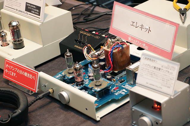 イーケイジャパンが展開する電子工作キット「エレキット」のブースでは、シングル真空管アンプキット「TU-8150」「TU-8200」や、真空管ハイブリットポータブルヘッドホンアンプ「TU-HP01」などを展開。