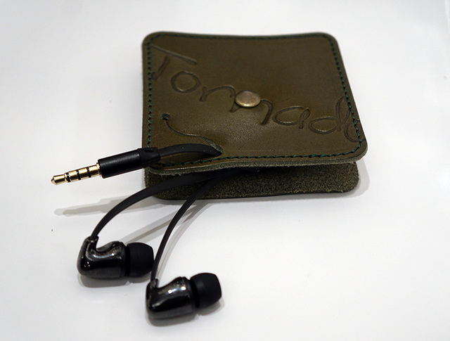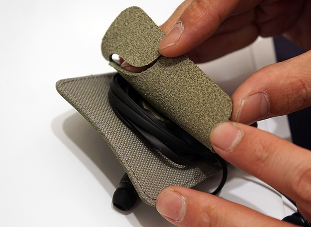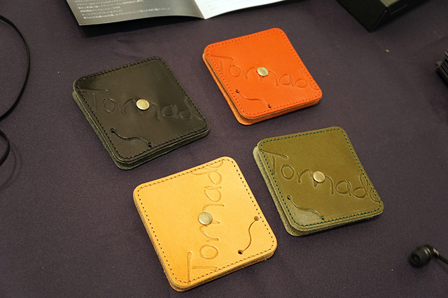 イヤホンケース「tornado」は想定売価5,000円程度の、栃木レザーを採用した巻き取り型ケース。内側にはエレクトロメッシュシートを備え、イヤホンやケーブルの静電気を除去することができる。4色のカラバリを揃えていることも特徴だ。