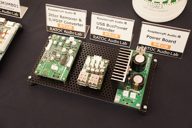 そのほかラズパイ・オーディオ用のジッターリムーバー・S/PDIFコンバーター、USBバスパワーエクステンダー、パワーボードなど、ラズパイオーディオを拡張するためのボードを参考出展。いずれも発売時期は未定とのことだった。