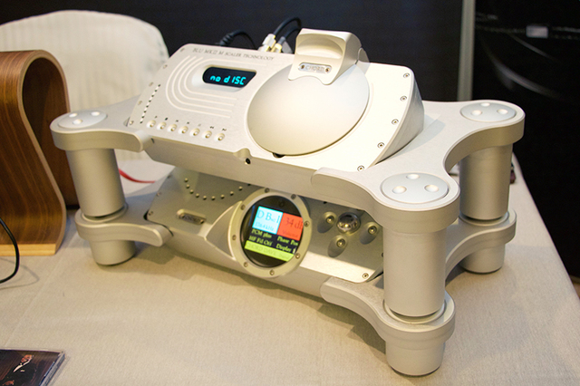 CHORDは、CDトランスポート「Blu MkII」と旗艦D/Aコンバーター「DAVE」の組み合わせ試聴スペースを展開。Blu MkIIは、100万超タップの演算数による独自のアップサンプリング処理「M-SCALER」によって、CDを最大705.6kHz(デジタル入力時は最大768kHZ)で再生できるCDトランスポートで、価格は140万円(税抜)。現在、発表当初から大きな仕様変更が発生して発売延期となっているが、本イベントでは最終確定仕様での実機を出展している。