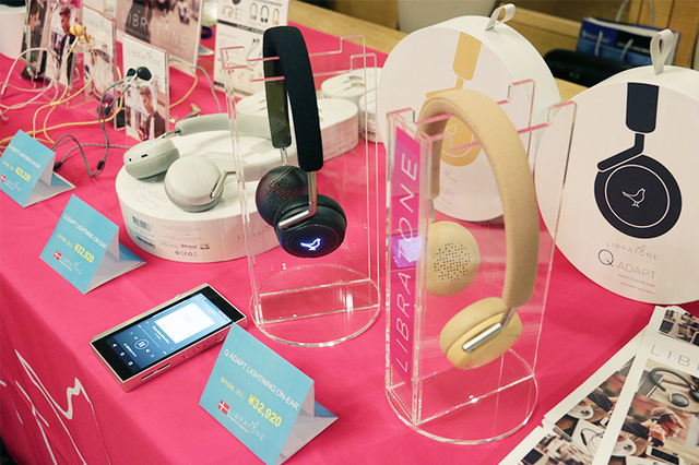 LIBRATONEは、Bluetoothヘッドホン「Qadapt WIRELESS ON-EAR」」と、Lightning接続イヤホン「Qadapt LIGHTNING IN-EAR」をメインに出展。同ブランドが従来から取り扱っているBluetoothスピーカー製品も合わせて展示している。