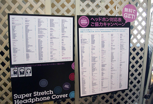 mimimamoのブースでは、ヘッドホンカバー「mimimamo」を展示。恒例の「ヘッドホン対応表ご協力キャンペーン」も実施している。同社のヘッドホン対応表に載っていないヘッドホンを持って行ってテストすると、「mimimamo」がプレゼントされる。販売終了した古い機種や国内未発表モデルも大歓迎とのことだ。