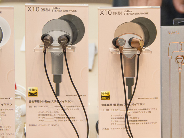 エム・ティ・アイのブースでは、自社ブランド“NUARL (ヌアール)”の、ハイレゾ対応イヤホン「X02(仮)」と「X10(仮)」を参考出展。6月頃の発売を予定している。