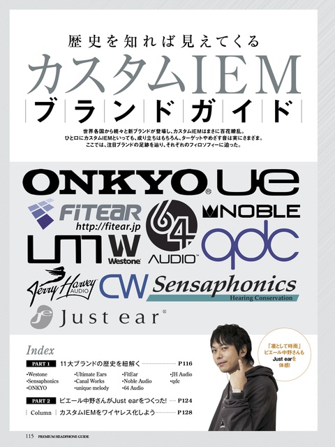それから「カスタムIEMブランドヒストリー」もオススメです。ますます注目度が高まるカスタムIEM。それぞれのメーカーの歴史や音づくりの哲学、製品の特長がわかる決定版的な内容になっております。これからつくりたい、と思っていらっしゃるユーザーから2台目、3台目をお探しのマニアまで、お役立ていただける情報が満載です。
