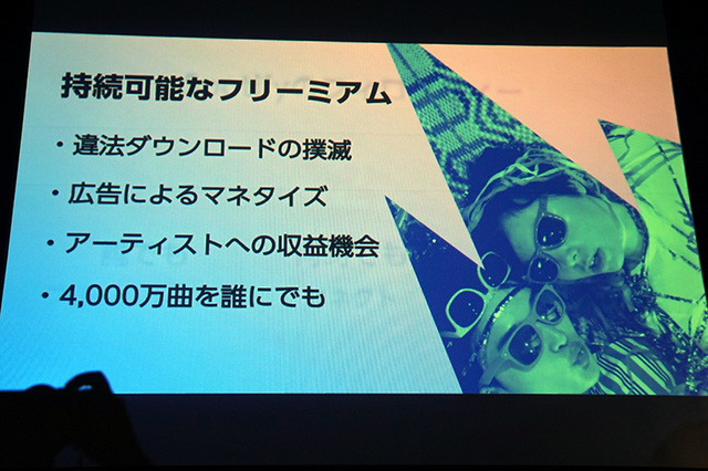 まず「誰でも」の分野では、持続可能なフリーミアムサービスであることを強調。「海外だけでなく国内でも、音楽の違法アプリがいまだにある。創業者はサービスを作るときに『自分たちの手で、違法ではない、合法なサービスを作ればいい。さらに便利にすれば、ユーザーには喜んでもらえるだろう』と考え、これを実践した」(玉木氏)。