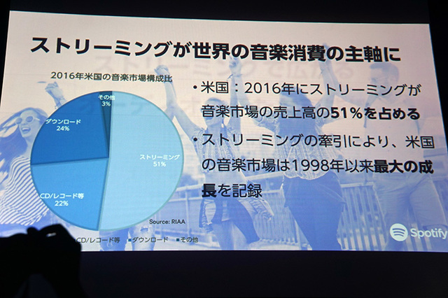 続いて玉木氏は、音楽ストリーミングの現状について紹介。すでに様々なメディアで報道されているが、米国では2016年、音楽市場の51%をストリーミングが占めるまでに至った。さらに玉木氏は、米国の音楽市場が、ストリーミングの牽引により1998年以来最大の成長を記録したことも強調。ほかのサービスがストリーミングに置き換わっているわけではなく、全体の成長のコアになっていると説明した。
