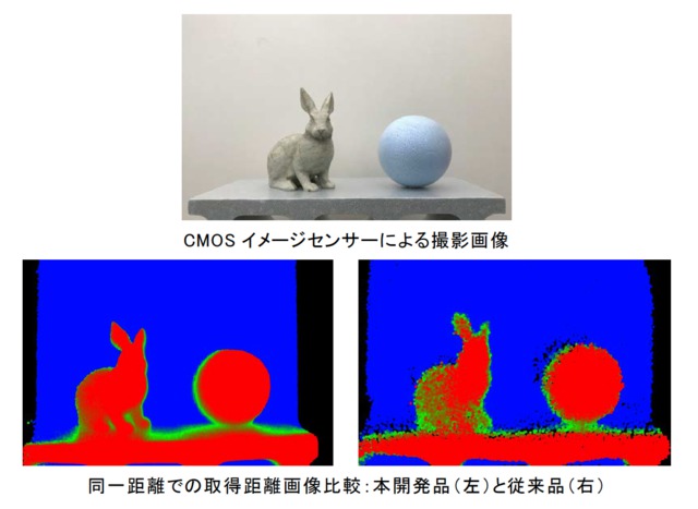 また反射光の利用効率を維持したまま駆動周波数を従来比で2倍(100MHz)に上げられるため、同一の距離において精度が向上、従来よりも高品位な距離画像が得られるとしている。1m測定時の距離誤差は、従来品が12.9mmに対して開発品は5.9mmとなる。