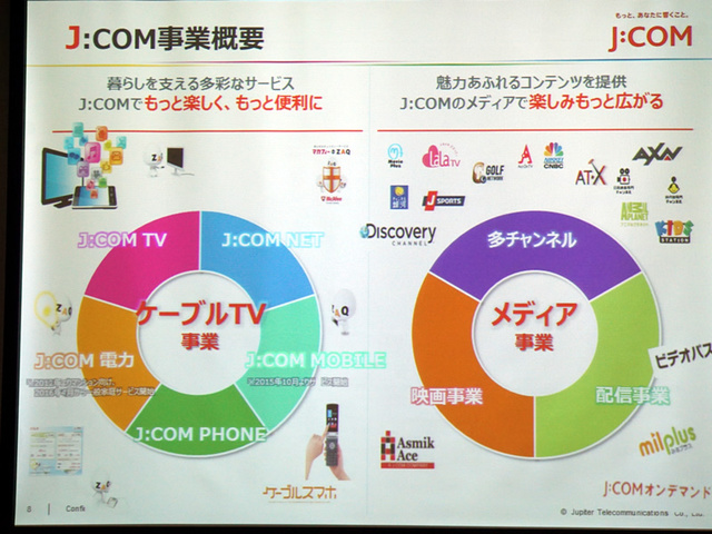 今年4月にジュピターテレコム取締役社長に就いている井村公彦(ひろひこ)氏は、コミュニティチャンネルによる地域密着情報の発信、電力や買い物(eコマース)など、ユーザーの様々な生活に同社のサービスが寄り添う「J:COM Everywhere」という考え方を披露。ケーブルテレビ(CATV)事業だけでなく、配信や映画などのメディア事業も含めて、あらゆるシーンで必要とされる会社になっていくという理念を掲げた。