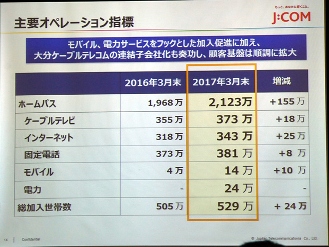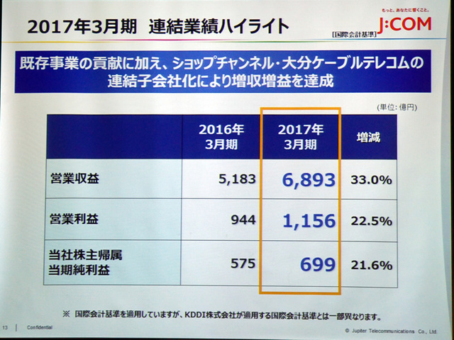 その上で昨年2016年度は「J:COM電力」での電力事業への参入、MVNO事業「J:COM MOBILE」での様々な施策などといったサービス強化や、コミュニティチャンネルでのオリンピック初放送、ジュピターショップチャンネルおよび大分ケーブルテレコムの連結子会社化などを展開。その結果、営業収益6,893億円(前年比33.0%増)、営業利益1,156億円(同22.5%増)、純利益699億円(同21.6%増)と、増収増益を達成した。
