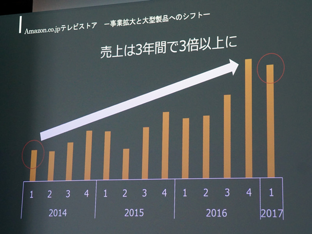 アマゾン(Amazon.co.jp)では、テレビの販売ページを「Amazonテレビストア」として展開。各社のテレビを取り扱っているが、テレビストアの売上が3年間で3倍以上に伸長するなど非常に好調という。