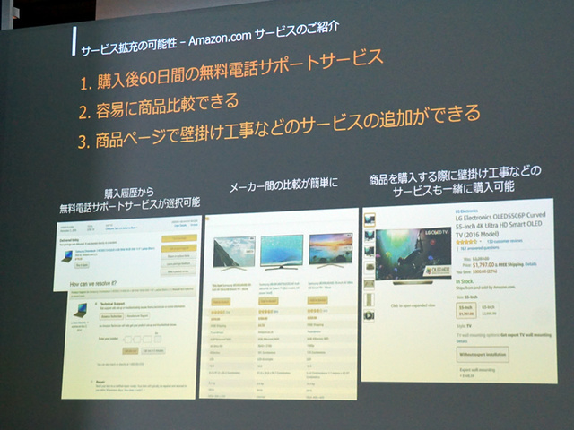 無料電話サポートは例えば周辺機器との接続方法などといった問い合わせに答えるというもので、製品ごとにメーカーが異なる場合でもアマゾンが一括でサポートすることで、ユーザーにもメーカーにもメリットをもたらしていると説明する。製品比較機能は日本でも一部ジャンルで導入しているが、テレビについても将来的な導入を検討しているという。