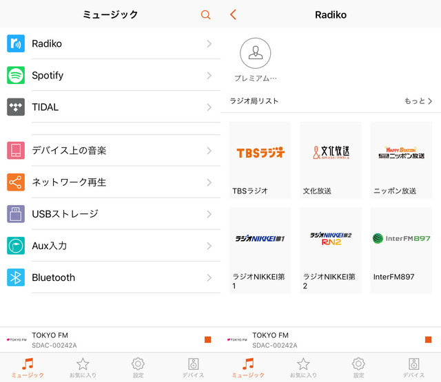 今回のアップデートにより、「Sonica」再生メニュー内に「Radiko」の項目が追加。IPサイマルラジオサービス「radiko.jp」の聴取に対応する。radiko有料会員「radiko.jpプレミアム」の会員特典である、日本全国のラジオを地域制限無しに聴くことができるエリアフリーも利用できる。