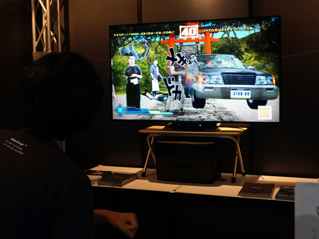 デイジーは、VR格闘ゲーム「NARIKIRI SHOWDOWN」をデモ。UnityとKinectタイプのセンサーを用い、プレーヤーの動きをゲーム内に反映させるというもので、パンチや必殺技で自動車を壊すという、某ゲームのボーナスステージのような体験をVRで楽しめた。