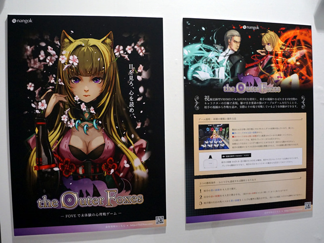 南国ソフトは、ネット対戦している相手の視線やまばたきも利用して相手の手を読むVRテーブルゲーム「the Outer Foxes」を参考展示。視線追跡を行えるヘッドマウント「FOVE」を使用し、プレーヤーの視線やまばたきをVR空間のキャラクターにもリアルタイムで反映させるというもので、相手の視線から作戦を読んで駆け引きするような体験ができる。将来的にはインターネットカフェで本作を体験できるようになる予定という。
