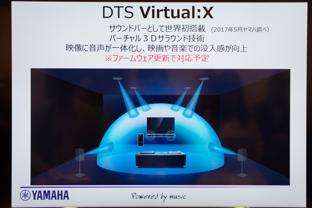 新機能として、発売後の2017年夏中に予定されるファームウェアアップデートで、サウンドバーとしては世界初というDTS Virtual:Xに対応する(関連ニュース)。これにより、トップスピーカーやイネーブルドスピーカーを使わずに、バーチャルサラウンドで高さ方向を含むイマーシブオーディオを再現できるとしている。アップデートはマイクロUSB端子を経由して行う。