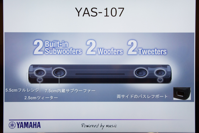YAS-107は5.5cmフルレンジスピーカー2基、2.5cmトゥイーター2基、7.5cmサブウーファー2基を内蔵した、サブウーファーレス・モデル。布地のファブリックカバーを採用し、筐体のエッジに丸みを持たせ、高さを5.3cmに抑えた薄型のデザインとなっている。汎用金具により壁掛け設置にも対応する。筐体上部の操作ボタンはタッチセンサー式。実用最大出力は120W。外形寸法は 890W×53H×131Dmm、質量3.4kg。