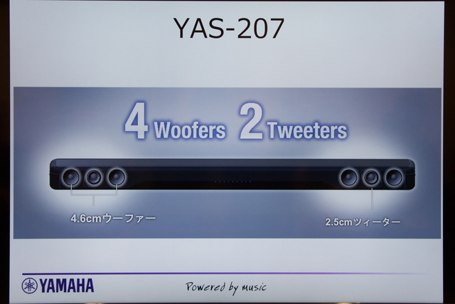 YAS-207は4.6cmのウーファー4基、2.5cmのトゥイーターで構成されるセンターユニット(サウンドバー)と、16cmユニットを備えたワイヤレス・サブウーファーで構成されるモデル。センターユニット、サブウーファー部ともにファブリックカバーを採用したデザインとなっている。