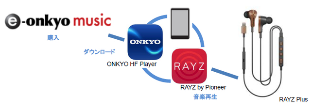 「RAYZ Plus」と専用アプリケーション「RAYZ by Pioneer」、「Onkyo HF Player」との連携を強化。RAYZ PlusをiPhone などにつなげることで、インストールされている Onkyo HF Player が無償でアップグレードされ、そのフルバージョン機能が利用でき、FLACやDSDなどのハイレゾフォーマットの再生ができるようになる。