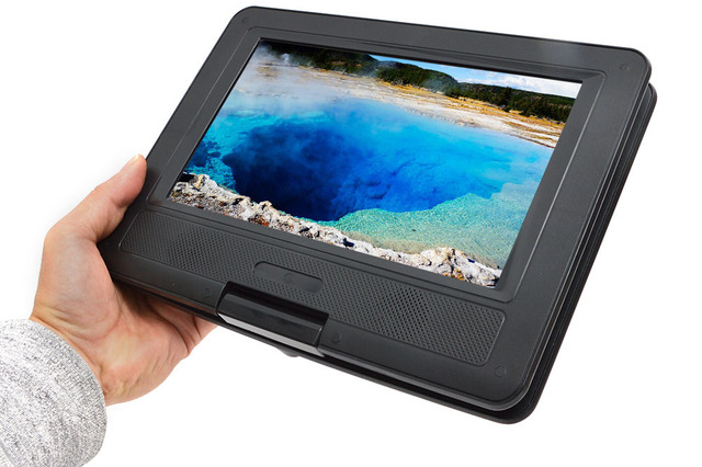 右に90°、左に180°回転して折りたたむことができる、9インチのディスプレイを搭載。音声は内蔵スピーカー、またはヘッドホン端子から出力する。付属のAVケーブルにより、RCAプラグで映像/音声の出力も可能。