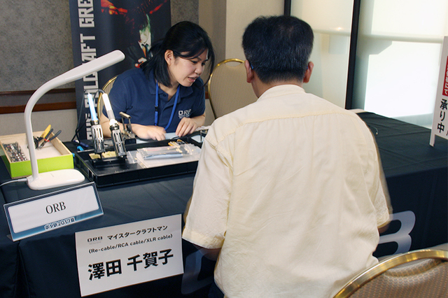 製品展示の隣では、女性マイスターによるケーブルのカスタマイズ実演を実施。長さや色の変更など様々なカスタマイズを直接受け付けている。同社は品質を重視した製品作りのため、マイスター制度を採用。販売されるケーブルの全てが、資格を取得した社員によって製作されているとのこと。