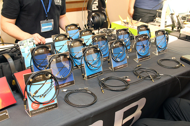 ORBは同社のケーブルシリーズを一斉展開。7月24日発売予定のヘッドホンリケーブル「Clear force」シリーズの3.5mm 4極端子採用モデル(関連ニュース)を参考出展している。