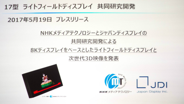ジャパンディスプレイの8K高解像度ディスプレイとNHK-MTの3D技術が組み合わされることで実現したライトフィールドディスプレイだが、「ベースとなった8Kディスプレイの品位をまだ出しきれていない」(林氏)といった課題があり、開発を継続していくとのこと。製品として市場に出せる時期も未定だが、今後技術に関してより詳しく公開することを予定しているという。