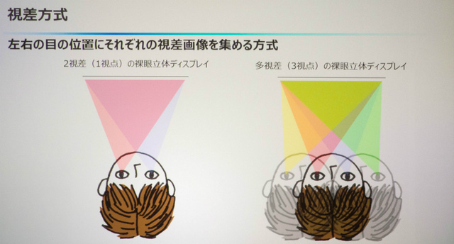 現在、裸眼で3D映像を楽しめるディスプレイでは一般的に、視聴者の左右の目にそれぞれ違う映像を投影し、その視差から立体感を生み出す「レンチキュラー方式」「パララックスバリア方式」といった「両眼視差方式」が採用されている。以前、東芝から発売されていた「グラスレス3D」レグザに採用されていたのも両眼視差方式だ。