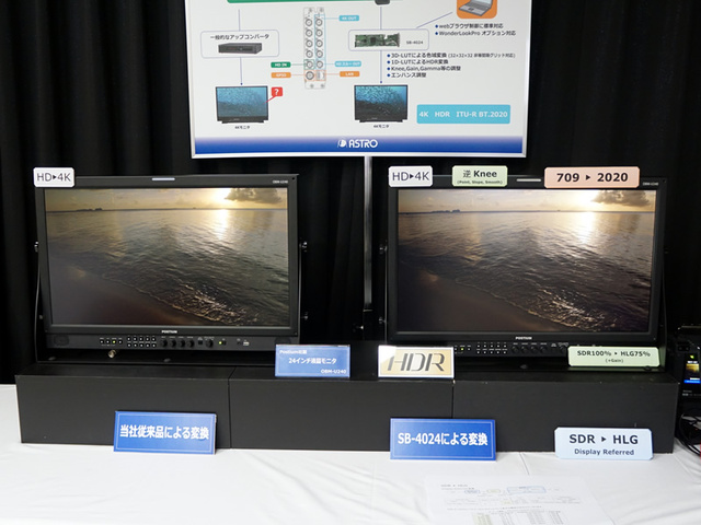 また、4K HDR関連の製品群も各種展示。HD映像を4Kにアップコンバートするコンバーターボード「SB-4024」では、3D-LUTによる色域変換、1D-LUTによるHDR変換、Knee/Gain/Gamma等の調整やエンハンス調整に対応し、4K HDR ITU-R BT.2020へのアップコンバートが可能であることを紹介するなどもしている。