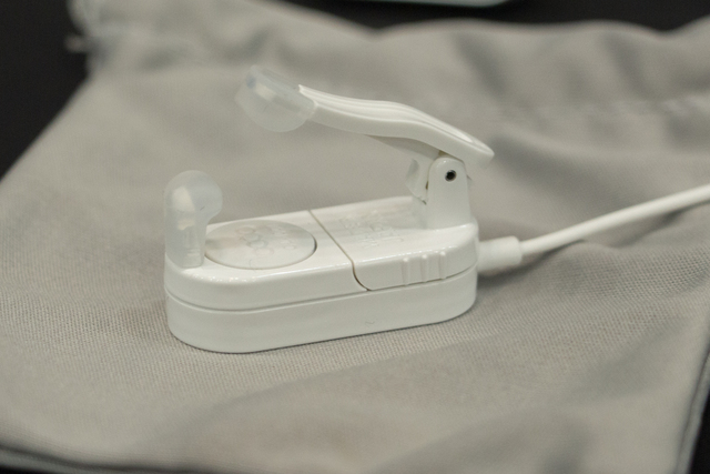 音楽リスニング用には、有線モデル「WR-3 CL-1001」と、Bluetoothモデル「BT-3 CL-1001」を用意するが、今回は有線モデルのみが出展された。本機は本体のクリップで耳の軟骨を挟んで取り付けるのだが、こういった接点が小さい装着は通常の骨伝導技術では難しく、earsopenだからこそ可能なのだという。