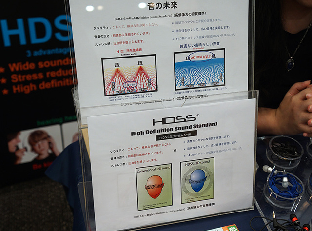 HDSS INTERNATIONALは、独自のHDSS技術をアピール。HDSSは音の拡がり感を加える技術で、圧迫感がなく、しかも高解像度な音を実現できると主張している。なおブースには、このHDSS技術を搭載したNUARLのイヤホン「NE01」「NX01A」が置かれ、実際の聞こえ方を試すことができる。