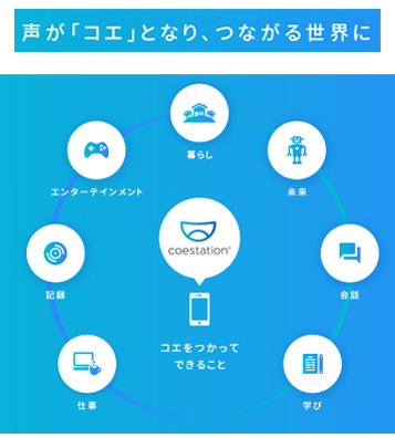 コエステーションの一般ユーザーは、スマートフォンのアプリを使用し、指定の文章を読み上げて声の特徴を学習させることで、自分の声の分身である「コエ」を生成。SNSやゲームなどさまざまな場面で、この「コエ」を使い、任意のテキストを発話することができる。