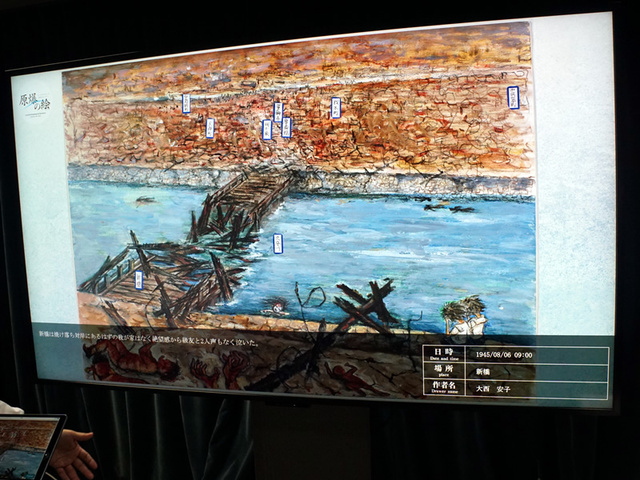 そして番組に合わせて、NHKと資料館が共同で、この約4,200枚の「原爆の絵」全てを超構成画像で記録しデータベース化。タブレット操作で検索することで、8Kモニターに広島の3D地図上に日時・場所情報とリンクさせて表示させるシステム「インタラクティブ8Kビューアー“原爆の絵”」を制作した。