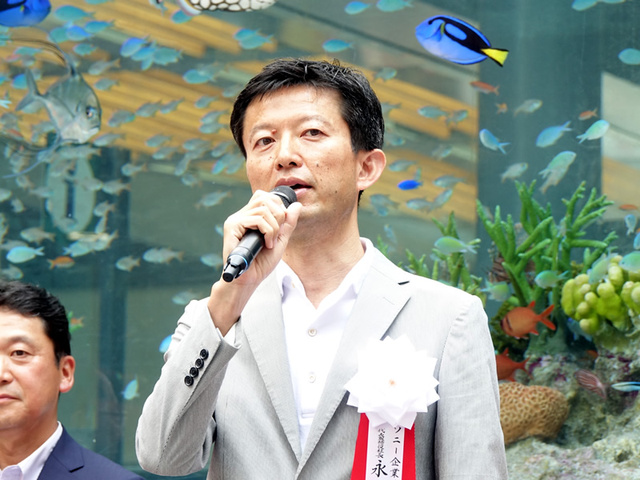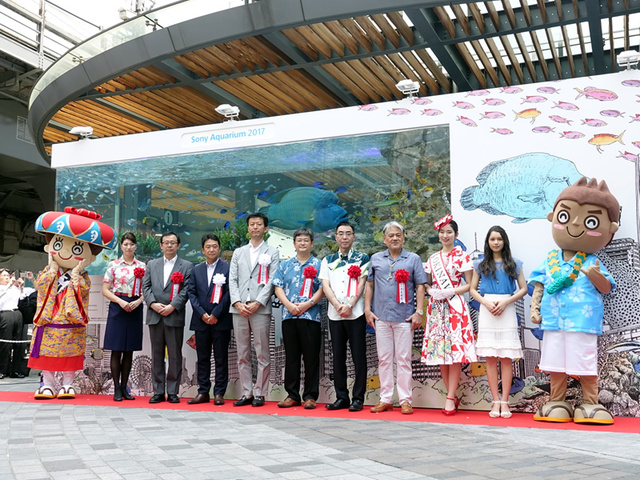 銀座の街に沖縄の美ら海を再現するソニーのイベント「Sony Aquarium(ソニーアクアリウム)2017」が開幕。毎年の会場だった銀座ソニービルが建て替えのため使えない今年は、有楽町駅前広場とソニーショールーム銀座の2ヶ所で開催。初日となった本日7月31日は、沖縄美ら海水族館副館長の佐藤圭一氏や沖縄・伊江島出身のシンガーソングライターAnlyさんらも駆けつけて大水槽の除幕式が行われた。