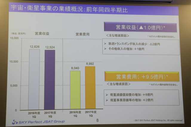 各事業の詳細についても紹介。メディア事業の営業収益減の要因は、「サッカー関連コンテンツ収入の減少」で17億円減、「その他視聴料収入の減少」で7億円減、「その他収入の減少」で3億円減とのこと。宇宙衛星事業の営業収益減の要因としては、「放送トランスポンダ収入の減少」における2億円減、「その他収入の増加」での1億円増が挙げられた。
