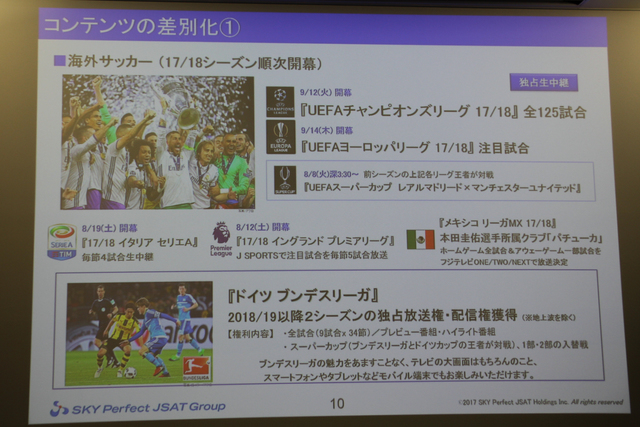 具体的なコンテンツについても紹介。海外サッカーについては、「UEFAチャンピオンズリーグ17/18」などの独占生中継に加えて、「ドイツ ブンデスリーガ」の2018/19以降の2シーズンの独占放送権・配信権(地上波除く)を獲得したことを紹介。本田圭佑が移籍した「メキシコ リーガMX」の17/18シーズンもフジテレビONE/TWO/NEXTで放送されるなど、海外で活躍する日本人プレーヤーを積極的に取り上げていくとした。