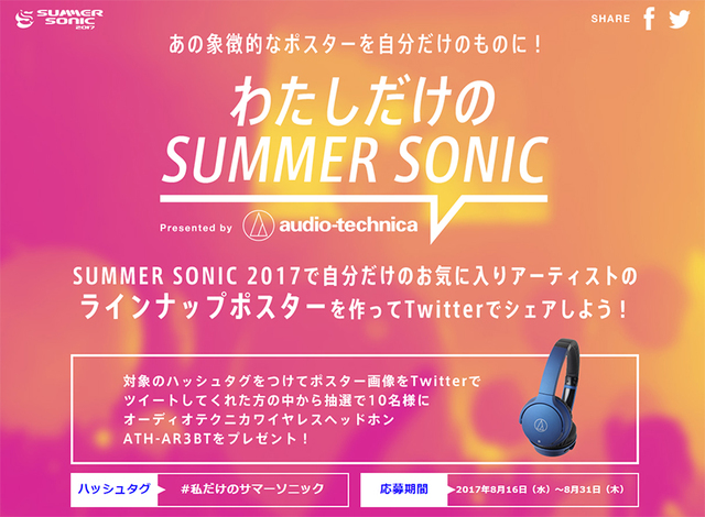 本キャンペーンでは、音楽フェス「SUMMER SONIC 2017」に出演するアーティストの中から、自分の好きなアーティストを選び、特設サイトよりオリジナルラインナップのポスター画像を作成。そのポスター画像を、ハッシュタグ「#私だけのサマーソニック」をつけてTwitterで投稿すると、抽選で10名に同社のワイヤレスヘッドホン「ATH-AR3BT」が当たる。ポスターデザインは、デジタルアーティスト「wataboku」さんとの書き下ろしコラボフレームを含めた合計5種類を用意する。