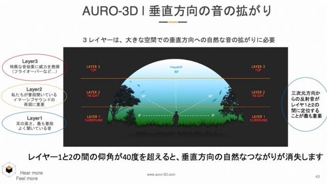 また、ハイトスピーカーの設置位置については、リスナーに対して水平の位置から30度の高さ(レイヤー1と2の仰角)を理想としている。高さは最低でも20度は必要で、逆に40度を超えると垂直方向の自然な繋がりが失われてしまうのだという。