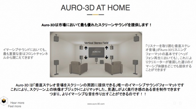 そして2014年には、家庭向けの「Auro-3D HOME ENTERTAINMENT」が登場。欧米のコンテンツホルダーから対応ソフトが登場し、デノンをはじめとするAV機器メーカーが対応を果たした。