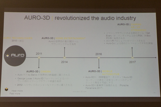 以降はモバイル向けや車載向けにも技術を提供。2016年には、Auro-3D音声を収録した初のゲーム『Get Even』が、バンダイナムコからPS4やXBox向けに発売された。VR向けのプロジェクトやストリーミングでのデモも行われている。