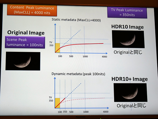 小塚氏によれば、HDR10+では様々なデータを送っているが、最大輝度という観点に限定して説明した場合、HDR10+の効果は、最高輝度が500nits程度のテレビで最も大きくなるとのこと。逆に言うと、1,000nits程度ある高級テレビで、さらにローカルディミングが適切に行われた場合、HDR10+の効果はあるものの、限定的なレベルにとどまるという。