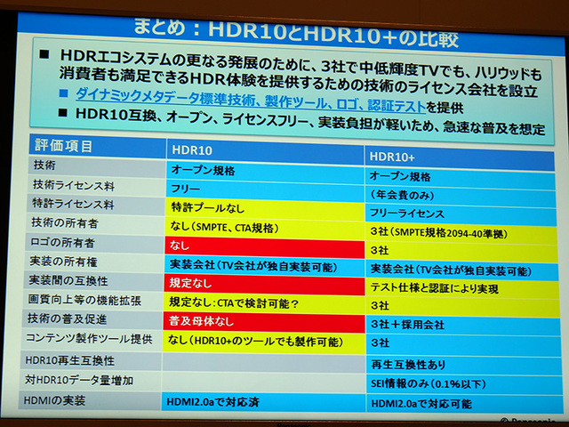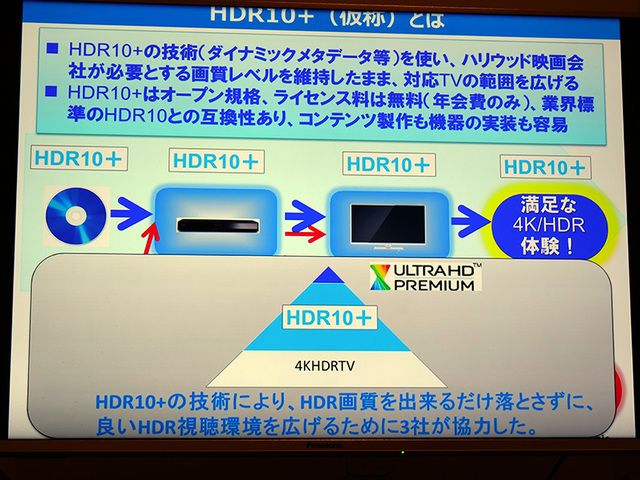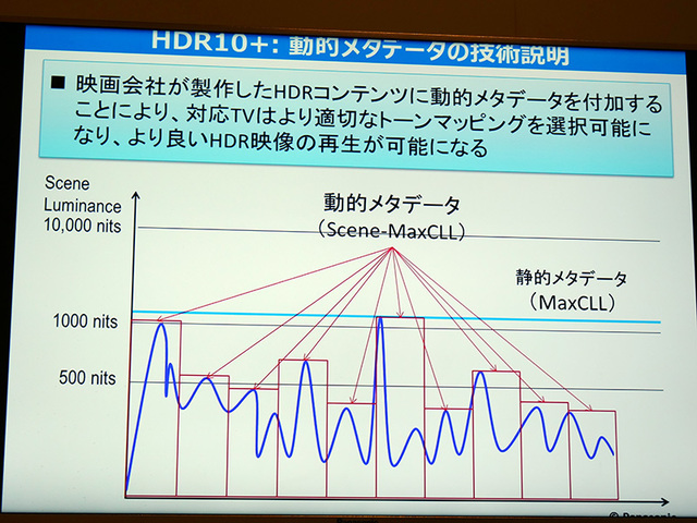 「その考え方自体は良かったが、対応しているのが超ハイエンドモデルばかりだと、より良いHDR視聴体験が広がらない。そうするとソフトが売れず、コンテンツが広がらない。これはソフトメーカー、ハードメーカーともに死活問題になる」と小塚氏は述べ、「ハリウッドが求める画質レベルを維持したまま、より多くのテレビで体験できるようにするため、HDR10+を推進することに決めた」という。実際に、20世紀FOXが規格に賛同したことも、HDR10+をパナソニックが推進する大きな後押しになったという。