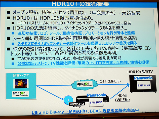 HDR10+はオープン規格であり、特許ライセンス料も不要。技術ライセンス料として年会費が必要だが、ユニットごとのロイヤリティーは発生せず、大手メーカーが1台ごとにコストをならすと「ほとんどゼロに近くなるのでは」というのが小塚氏の説明だ。