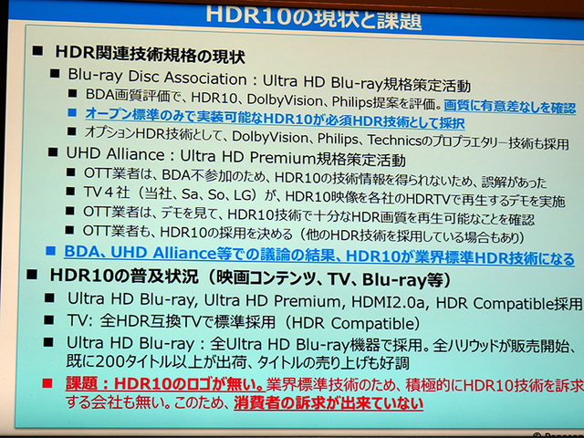 小塚氏はUltra HD Premiumについて「このロゴが付いた製品やコンテンツを組み合わせたら、4K/HDRの良さが十分伝わる体験ができる、ということをお客様にわかりやすく伝えるために作ったもの」と、改めて当初の理念を説明する。