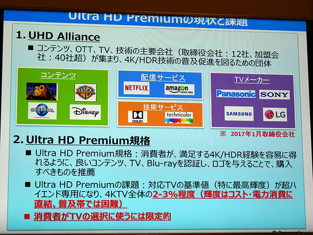 小塚氏は、このHDR10+規格にパナソニックが合流した背景として、パナソニックをはじめとしたメーカーやコンテンツ各社、配信各社がはじめた「Ultra HD Premium」規格が、あまり一般に普及していないことを挙げる。